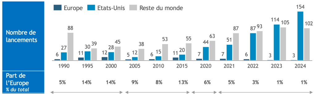 Une simple image qui fait mal. Alors que l’Europe, depuis les années 1990, se voit comme une superpuissance du spatial, nous ne pesons en fait… qu’1% des lancements mondiaux en 2024.